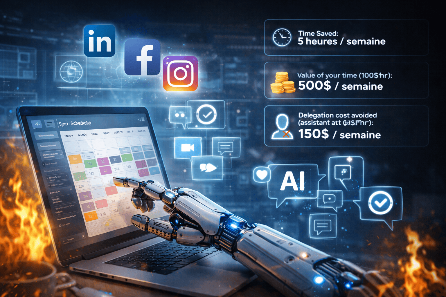 Managing Facebook, Instagram, and LinkedIn manually is a money pit. Our system schedules your posts for the entire month in one hour and uses AI to respond to repetitive customer questions in real time.